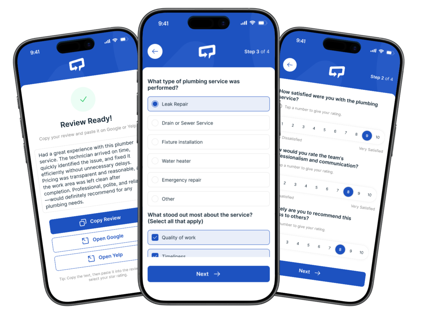 Shortcut sends a simple text link after the job. Your customer taps it, answers a few questions, and gets a ready to post review in under a minute — no blank page, no guessing what to say.